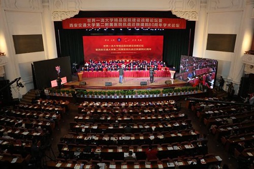 2017年10月24日,“世界一流大学精品医院建设发展战略暨西安交通大学第二附属医院抗战迁陕建院80周年学术论坛”开幕式在西安人民大厦大剧院召开。中共陕西省委、省政府、省人大、省政协、省教育厅、省卫生计生委,西安市委、市政府、市卫生计生委,中央新闻媒体驻陕西记者站、省市新闻媒体单位,中国卫生计生思政工作促进会,委属委管医院,友好医院,海内外各界校友,西安交通大学,西安交大二附院,西安交大二附院协作医院、医联体单位、历任领导、在职职工、离退休教职工以及学生代表共2000余人参会,欢聚一堂,共同鉴证这一意义非凡的历史时刻。
