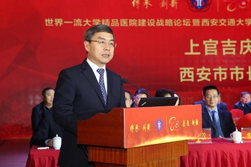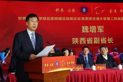 陕西省副省长魏增军代表陕西省人民政府做了重要讲话。魏增军表示,西安交大二附院是陕西省医疗卫生战线上的主力和先锋,为推进陕西省医疗卫生事业的繁荣,确保广大百姓,产生了积极而深远的影响。他殷切希望,西安交大二附院坚持可持续发展观,狠抓医院内部管理,着力增强团队的向心力和凝聚力,不断提升医院的社会效益和品牌形象。千方百计加快医院发展,把发展作为第一要务。把西安交大二附院建成一所西部一流医院,办成人民群众信赖、同行认可、政府满意的高品质医院。