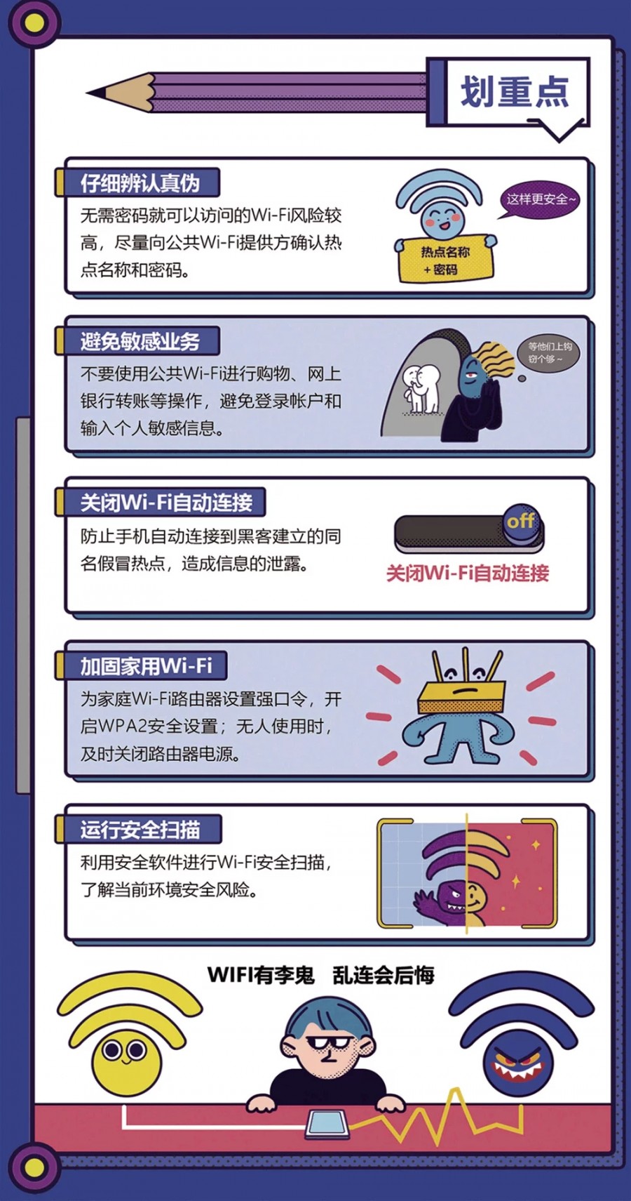 使用WiFi需谨慎,不要轻易去蹭网。使用之前去认证,账号密码不要输。网络不法分子多,手段高明招数多。要想安心蹭网用,以上内容要熟知。