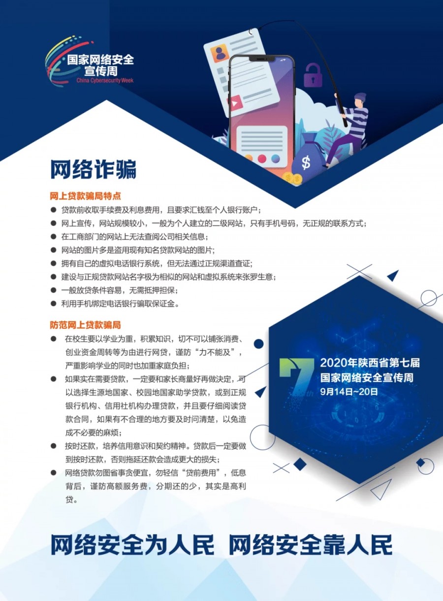 网上贷款有陷阱,天上不会掉馅饼。飞来大奖别惊喜,反复套钱洞无底。兜售抵押全是假,别听骗子说瞎话。炒股网站不能信,高利诱饵骗钱财。突遇情况要冷静,存疑拨打幺幺零。