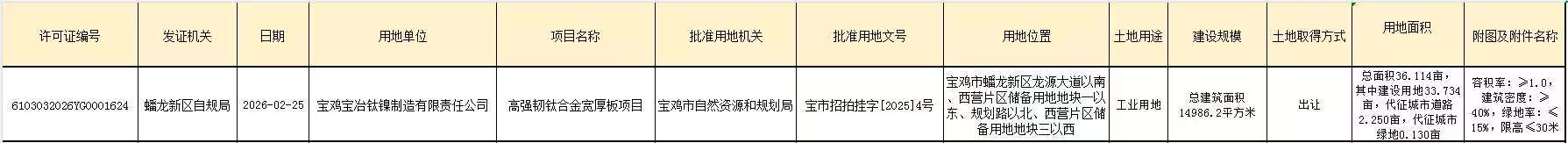 高强韧钛合金宽厚板项目建设用地规划许可公示
