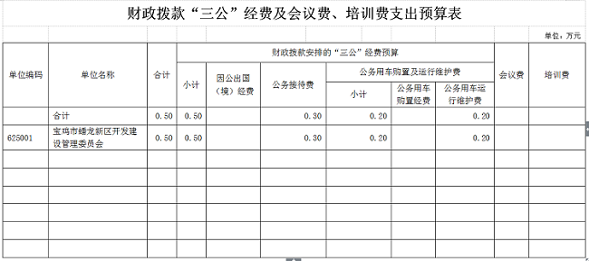 宝鸡市蟠龙新区管委会市本级2016年“三公经费”预算0.5万元,其中公务接待费0.3万元,公务用车运行维护费0.2万元。