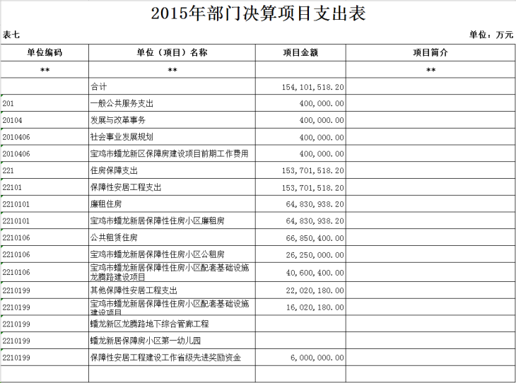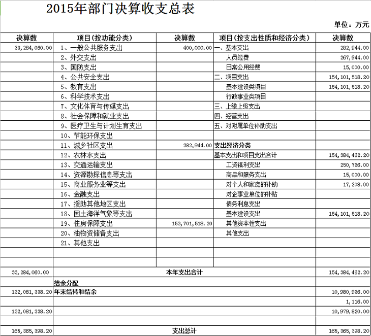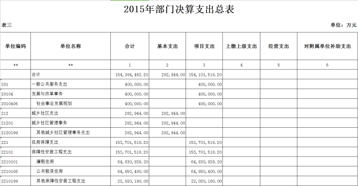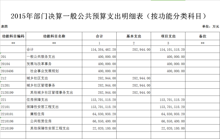 2.公共预算财政拨款支出决算具体情况。2015年度公共预算财政拨款支出15438.4万元,按支出功能科目分,包括一般公共服务支出40万元、城乡社区支出282.29万元、住房保障支出15370.15元(主要用于保障性安居工程,其中廉租住房支出6483.09万元、公共租赁住房6685.04万元、其他保障性安居工程2202.02万元)。